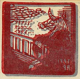 | 今は亡きナンシー関さんプロデュースのハガキサイズ消しゴム版を使って作ったもの。ぐずぐずしてたら9月になってしまった |